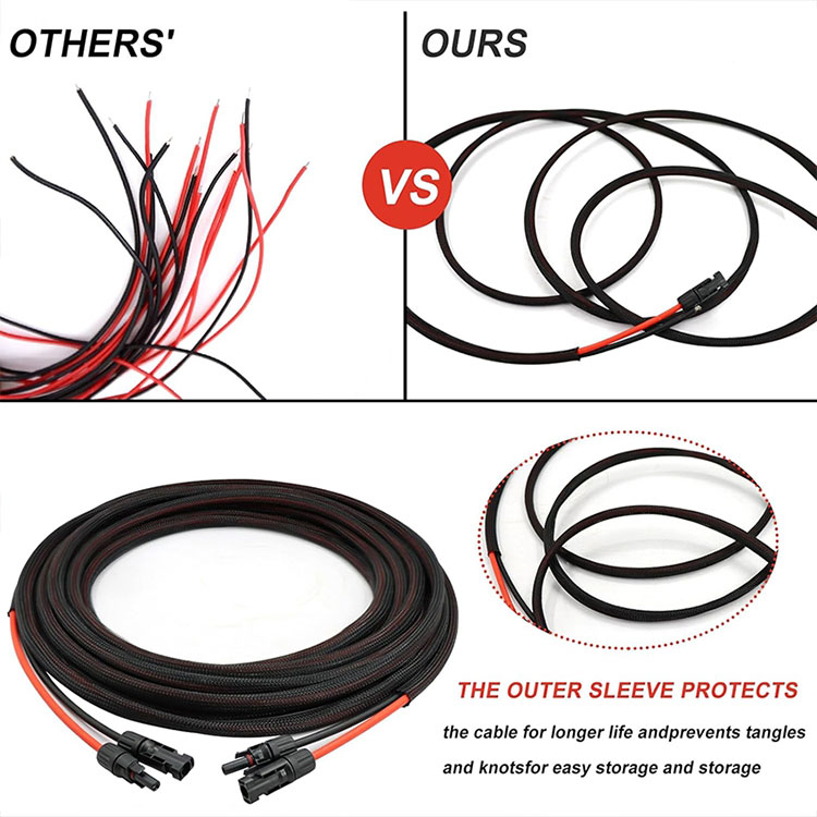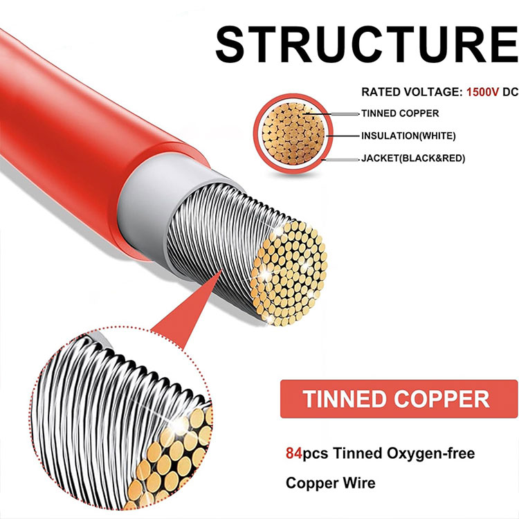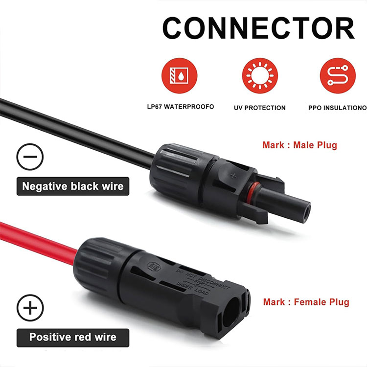 Materiais de alta calidade: os fíos dos paneis solares están feitos de materiais de cobre ou aluminio de alta calidade, que teñen unha boa condutividade e poden minimizar a perda de enerxía, garantindo o máximo aproveitamento da enerxía solar.